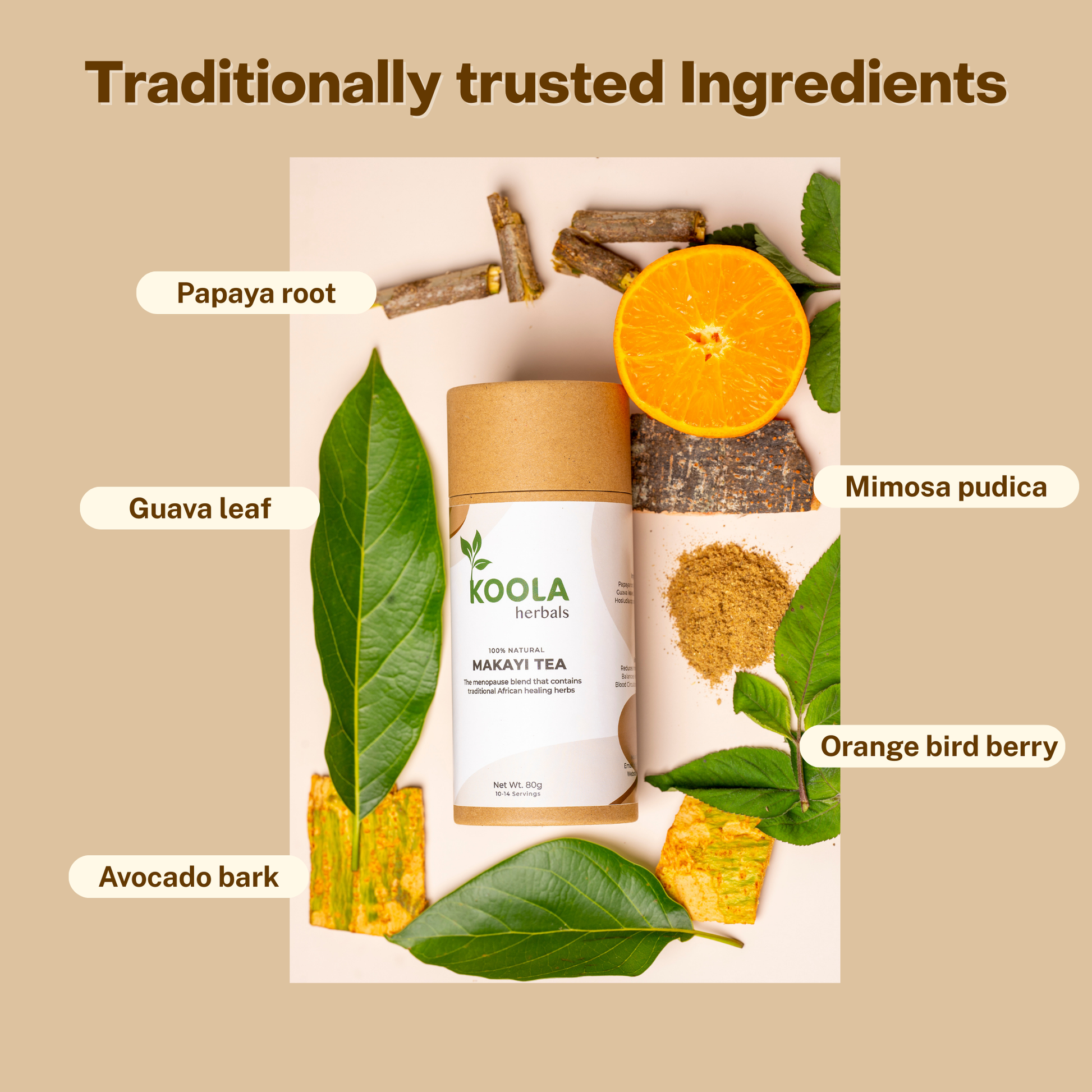 Avocado leaf, Guava leaves, and Papaya leaf in Makayi Tea contain natural compounds that help manage body heat, support hormone balance, and may reduce sudden warmth and night sweats linked to menopause.